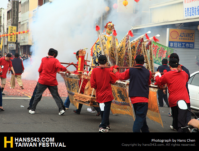 扛神轎的工作人員在經過點燃的鞭炮時,不是直接穿越的喔~