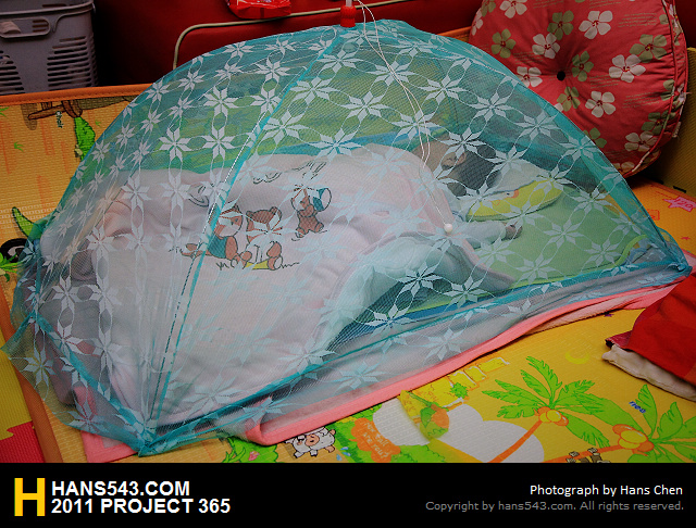 所以Q比媽上網採購了這個小蚊帳(很像在餐桌上用的那種XD),給Q比在客廳睡著時使用!