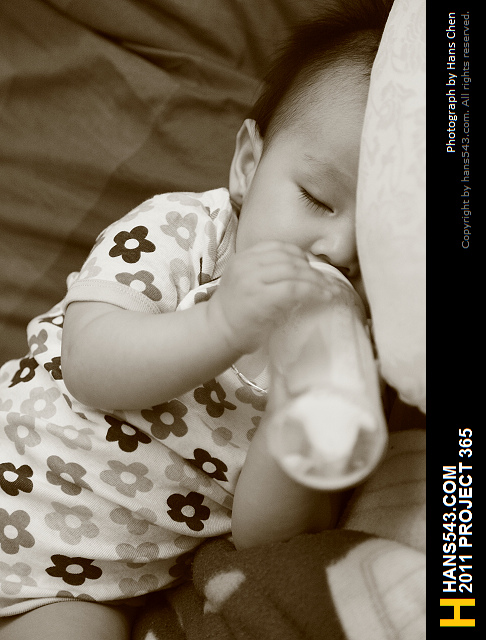 喝奶喝到睡著了,奶瓶還是緊緊握在手上XD