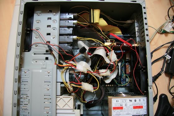 其實就是,把這個200G的硬碟還是鎖在電腦中(如此可以使用電腦中的風扇來吹硬碟),後端再接上轉為USB的介面,介面上的USB線再由電腦後方的PCI PORT洞中拉出來,接到電腦的USB槽;另外,介面上的電源線也是經由該孔拉出,需使用該硬碟時,只要插上電源,該硬碟就會出現!