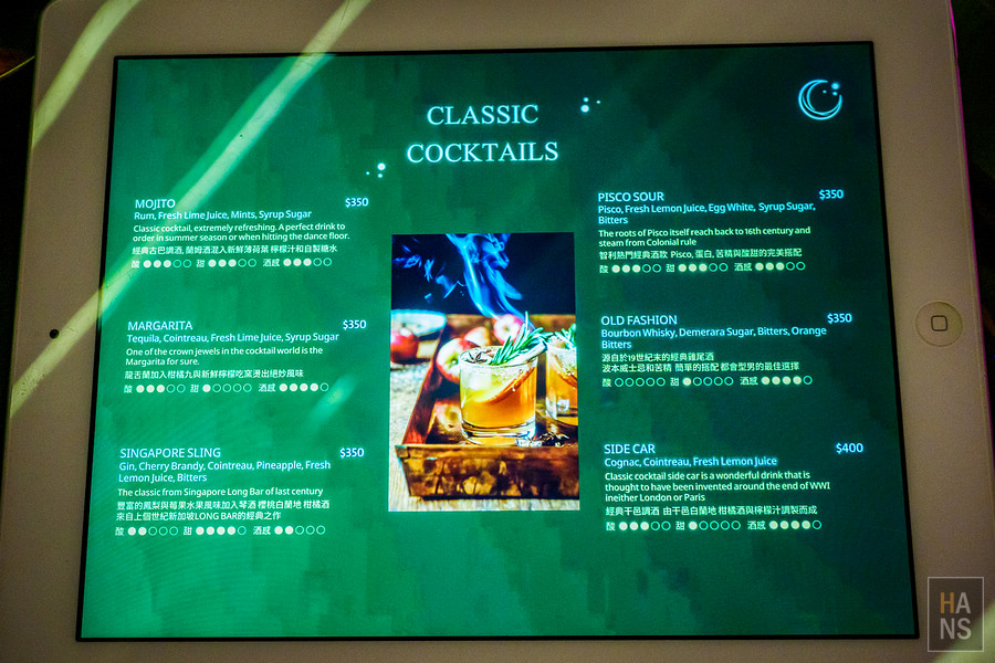 從 COYA Taipei 的菜單裡可以看到,COYA Taipei 提供了非常多的酒類單品以及調酒(據說他們的調酒師擁有十多年的調酒經驗,是調酒高手高高手呢!)。果然 COYA Taipei 是非常適合與三五好友來小酌,暢飲各式酒類以及多種創意調酒,杯觥交錯之際也可以點一些餐點或是小點、下酒菜來進行搭配,滿足聚會好友的所有需求。