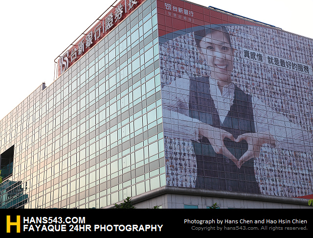 在快到港墘路時,翰斯看到台新銀行的牆上有大片的廣告看板,馬上請可樂停車跑下去拍(危險動作,請勿模仿),那時還是早上不到六點,所以沒什麼車XD;