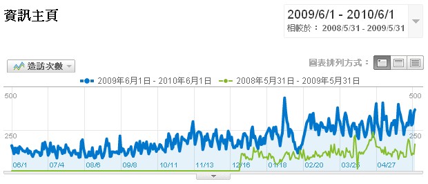 圖中藍色的部分是過去一年的造訪人次狀況,綠色的則是再往前一年的狀況,