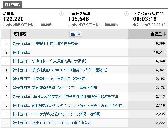 看完了關鍵字之後,來看看在「翰仔五四三」過去一年裡頭,哪些網頁被讀取的次數最多~