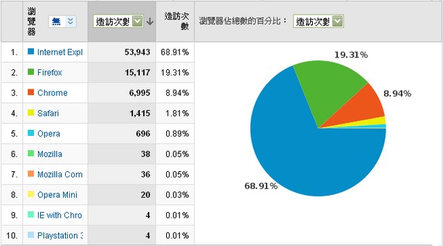 絕大部分仍是IE(雖然翰斯自己都是用Chrome居多),IE點進去之後,可以看得到IE8佔了50.48%最高,IE6佔了29.86%第二,IE7 19.63%第三(其他版本都在0.1%以下),看來使用IE6的朋友還是不少,翰斯在寫Blog時還是要注意一下現在許多效果都不支援IE6的狀況…(比如說不支援png圖檔、gif不會透明,及一些網頁語言不支援的問題…)