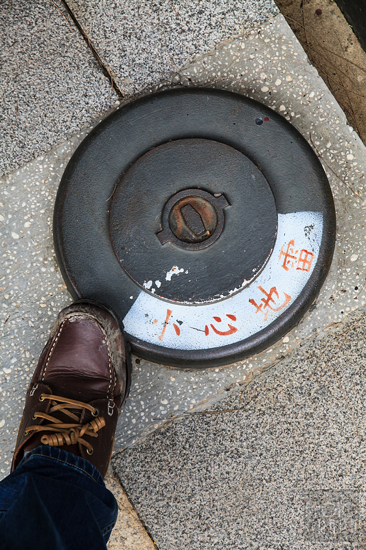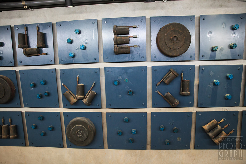入口處的地上,就有兩個基本地雷的模型,我想,這應該是真的地雷,去除內容物後的空殼。把自己的腳放上去來拍一張。(戰場上要是這樣的話,那大概就要和這條腿或是小命說掰掰了吧…)