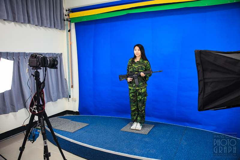 因為時間的關係,我們就沒有全部的人都更換迷彩服,我們請一位小美女換裝示範給大家拍照囉。
