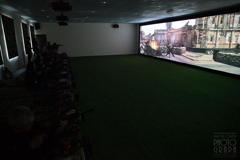 戰爭模擬場景不得不說真的非常酷,有三種不同的情境,民宅巷戰、海灘搶灘等等都有,就好像玩 CS 一樣(而且還拿著超像真槍的雷射槍),直接朝著超寬螢幕上的敵人扣下板機就對了!