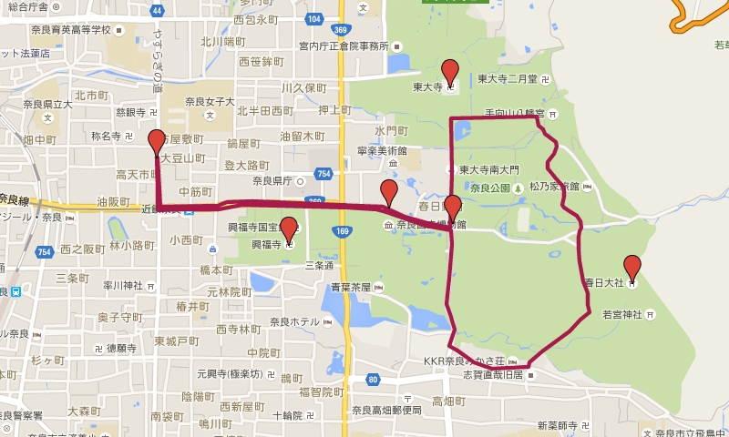 (大約畫一下,從左上角出發,中間我們有折回中點志津香釜飯吃午餐,再騎去春日大社,最後回到左上角)