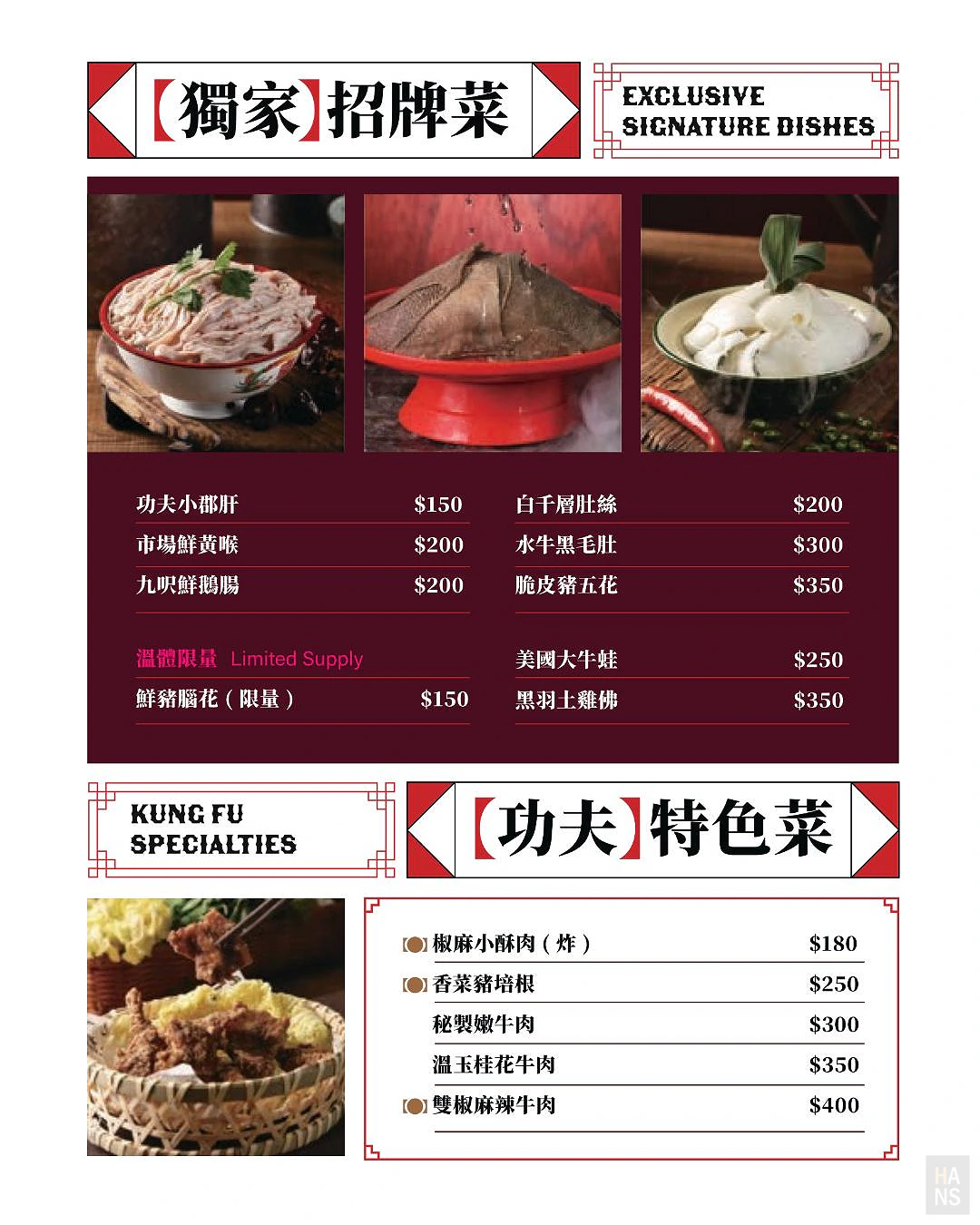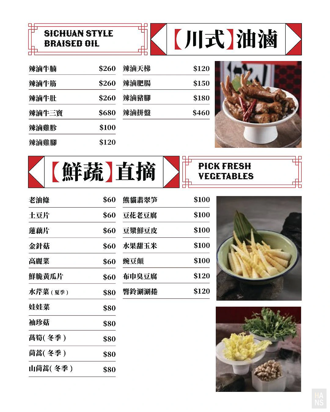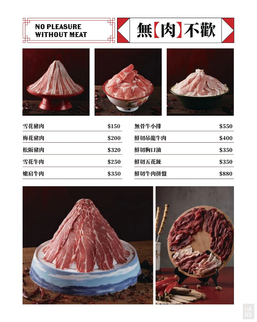 《李鐵柱老火鍋》的用餐與點餐是採用單點的方式,在單點菜色之前,要先選擇他們的招牌「鍋底」,包含了重慶火鍋招牌的「牛油全紅鍋」以及包含兩種湯頭風味的「子母鴛鴦鍋」,接著再點選想吃的菜色,其中大家公認的「雙椒麻辣牛肉」、「脆皮豬五花」下鍋涮煮後的確非常美味,是必點菜色👍(別急!後面我會慢慢和大家分享李鐵柱的美味餐點唷!)