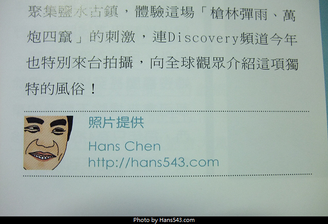 所以之前翰斯拍的平溪天燈、大龍峒保安宮、鹽水蜂炮的照片,就獲得採用囉~