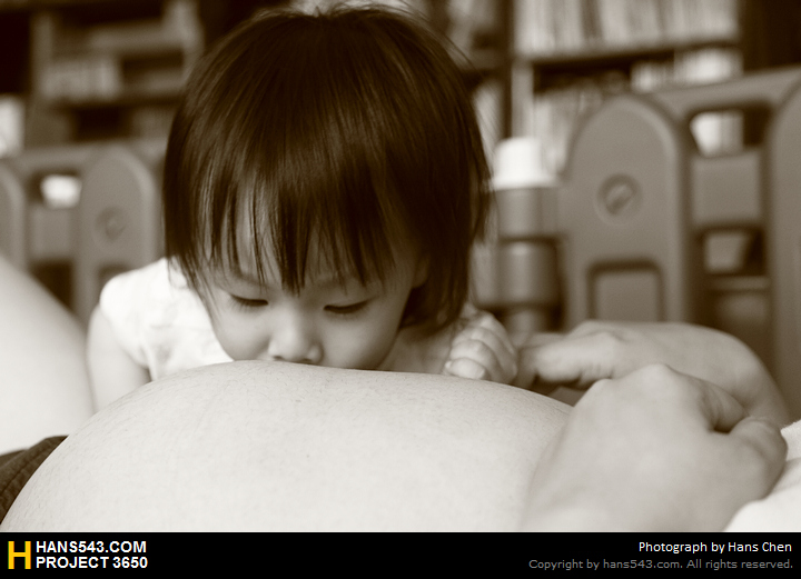 隨著時間的經過與愈來愈大的肚子,Q比似乎已經知道媽媽肚子裡有妹妹的含義了~
