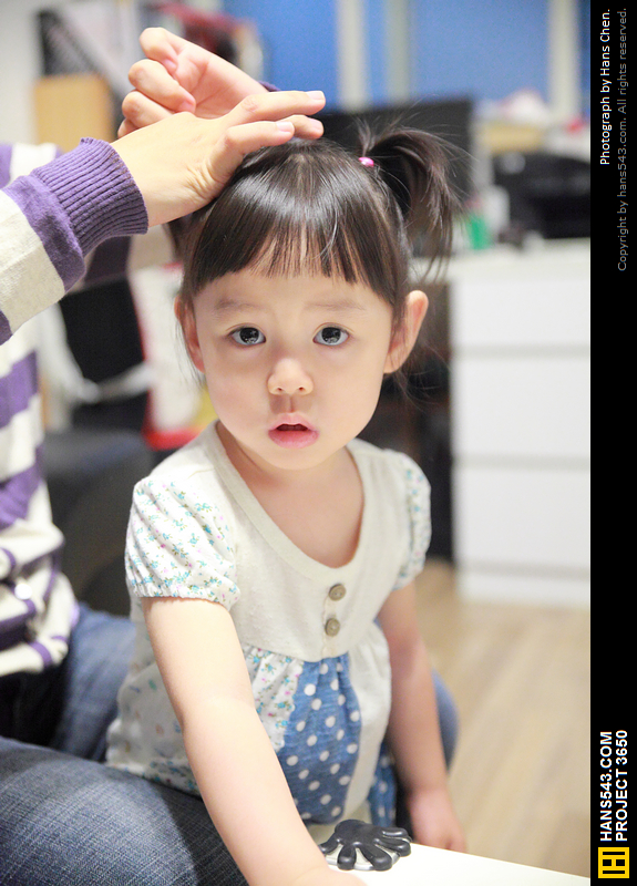 (因為最近Q比上學時,老師都會幫她綁頭髮,還蠻可愛的,所以也如法泡製,幫美比綁一下XD)