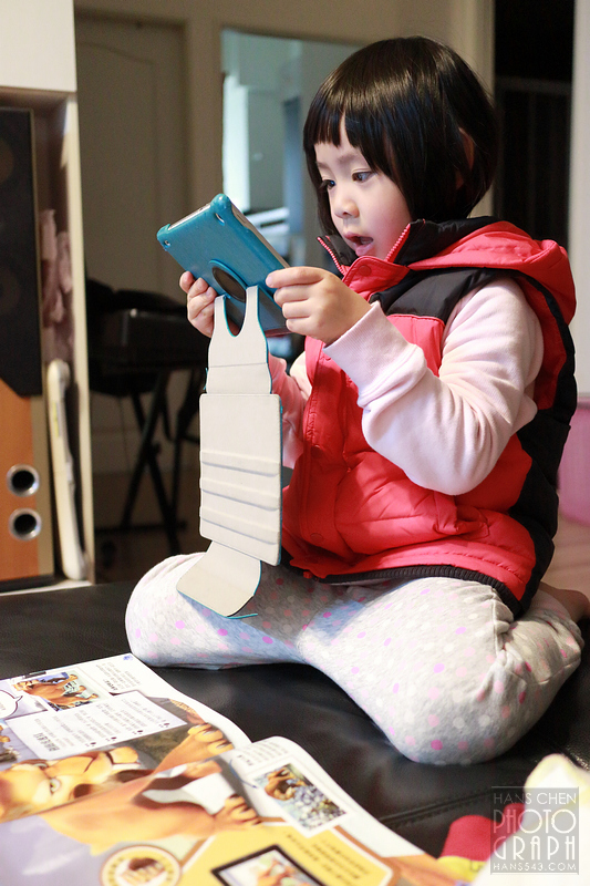 像美比正在看的這一本,就是冰河歷險記的童書,書上這頁一掃,就會出現立體的迪亞哥在現場環境裡走來走去的,使用 APP 裡的操縱功能,還可以控制迪亞哥的行動,美比顯得非常有興趣,讓迪亞哥在家裡到處亂走,開心得很。