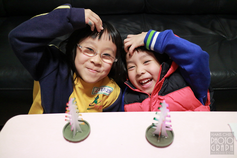 拿出相機請雙比和小紙樹合照,姐妹倆經過一番熱烈討論之後(是的,她們現在會決定自己拍照的 pose 了…),她們決定使用之前學到的大愛心,一人用一手來表示大愛心的一側。結果姐妹倆怎麼調整,姿勢就是怪怪的不對勁,最後拍照時,一秒變兩隻小猴子了XD