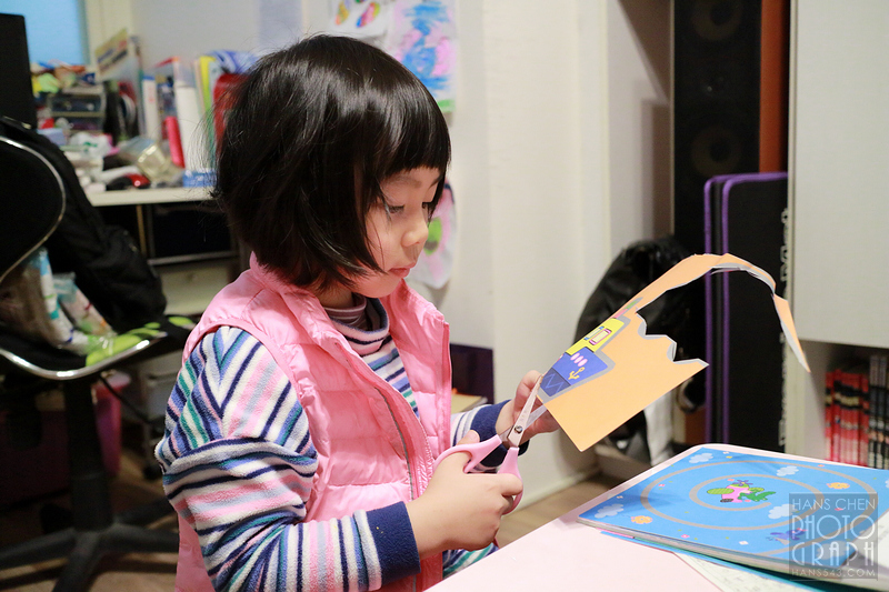 像照片裡的美比,就在進行使用剪刀的練習,以前很難想像我會用剪刀去剪一本書,但現在的教材提供簡單的粗框線條讓小朋友練習自己使用剪刀,除了簡單可愛的圖型之外,也有剪起來能變成立體概念能拉長為一條長長的線條的剪裁,美比對自已能順利的剪出書本上的形狀感到非常開心呢!