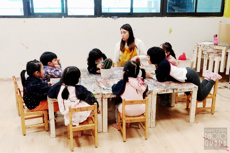 畫完第一張的筆觸之後,老師再把仙人掌放到桌上,原來,這才是今天要畫的主題,老師先讓小朋友實際從各個角度觀察、觸摸要畫的東西,並讓小朋友發表心得之後,才讓她們開始作畫。照片中央戴口罩的小朋友就是美比,一開始因為是新環境而原本有點怕生的她,後來待一陣子就熟了起來,又開始一直和老師有互動,適應得非常不錯呀!下課之後問她這裡好不好玩,她說她覺得非常好玩,那就…繼續在這裡上下去囉。