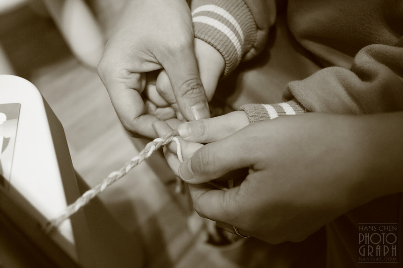 晚上回家看比媽抱著美比不出聲不知在做啥,原來是美比從學校帶回了編織的家庭作業,平常就會幫雙比綁辮子的比媽自然是駕輕就熟,手把手的在教美比綁織的技巧(這簡單的動作對小朋友來說其實並不簡單)。
