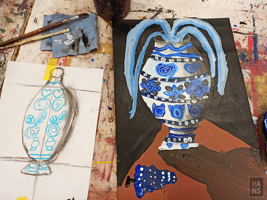 我一直很喜歡美比畫畫的用色,在物體外型的部分,上到她這個階段,理論上可以選擇素描或是油畫二選一了,不過美比說她想在這個階段再待一下(因為她很喜歡手作課程)。今天的花瓶,感覺得出來老師在教授靜物的觀察以及陰影,並且用了部分油畫的技法,只不過,那個植物是不是怪怪的?(笑)