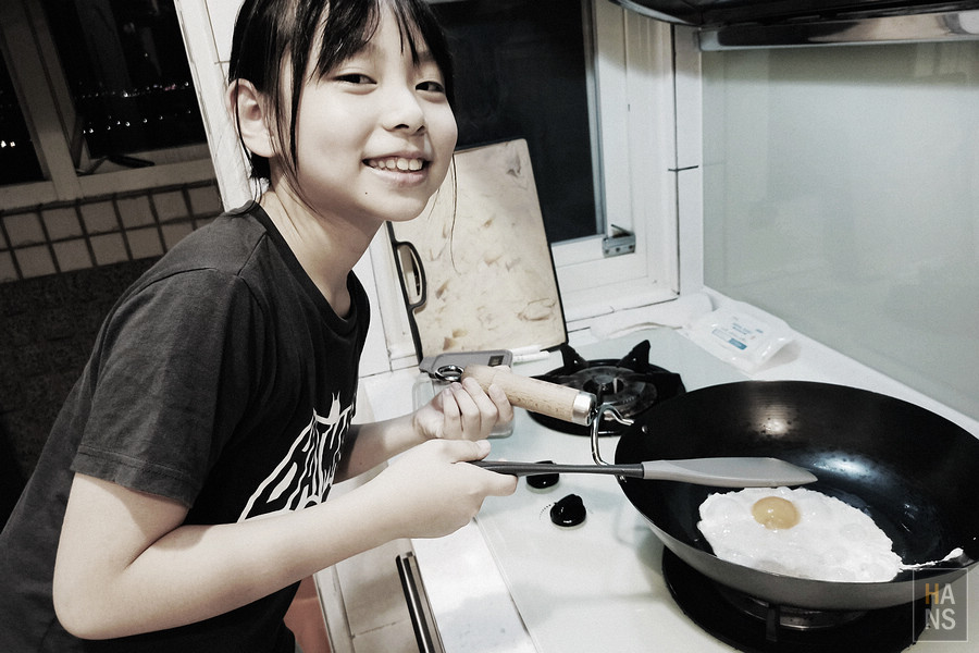 今晚回家,輪到美比在煎荷包蛋(煎得還蠻美的耶,鐵鍋容易煎焦,她煎得 hen 不錯!),一問之下,原來今天老師開的家庭作業,是煎荷包蛋,實在太促咪了 😆