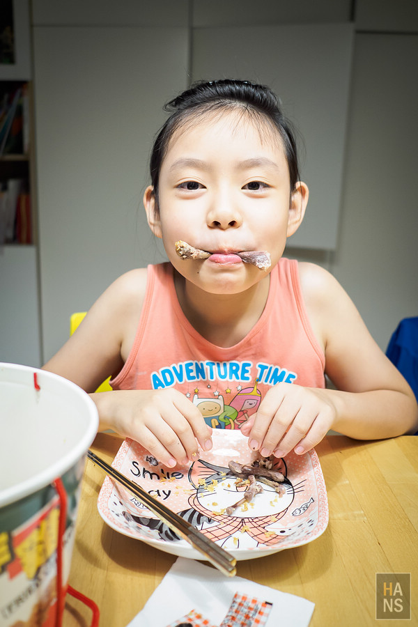 晚上點了拿坡里的炸雞和家人一起分享,吃了一隻雞腿的美比,突然請我幫她拍個照,自以為是彌肉子(笑)