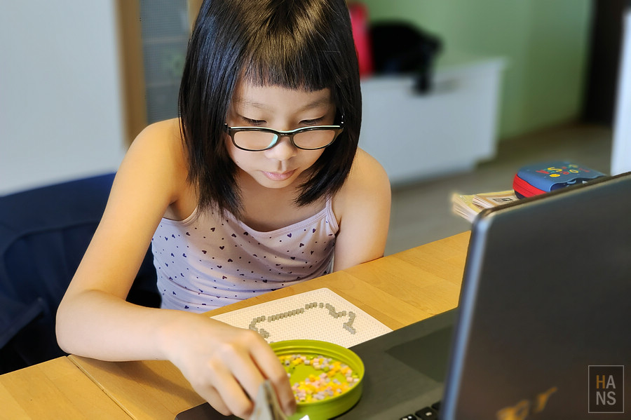 每天在家上課,足不出戶的日子裡,總是要找點樂子來做。Q比之前瘋過膠珠一陣子,但玩了一陣子又沒在玩了(小朋友好像都會這樣?🤣),現在又拿出來玩,Q比手算蠻巧的,很快就可以完成一幅作品,現在她的年紀也比較大了,我就手把手帶著她做一次,用熨斗熨完成膠珠作品的動作,後續就讓她自己來操作囉。