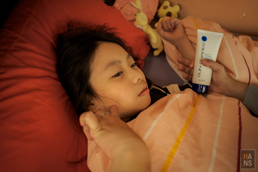 晚上小朋友睡覺前,比媽幫美比有點過敏的臉,塗上一些滋潤的乳液,呵護一下小朋友稚嫩的臉部肌膚。