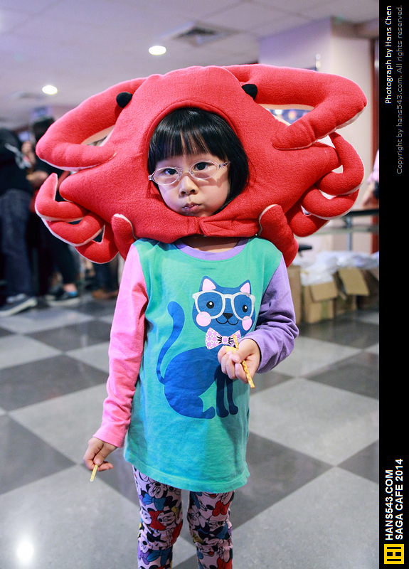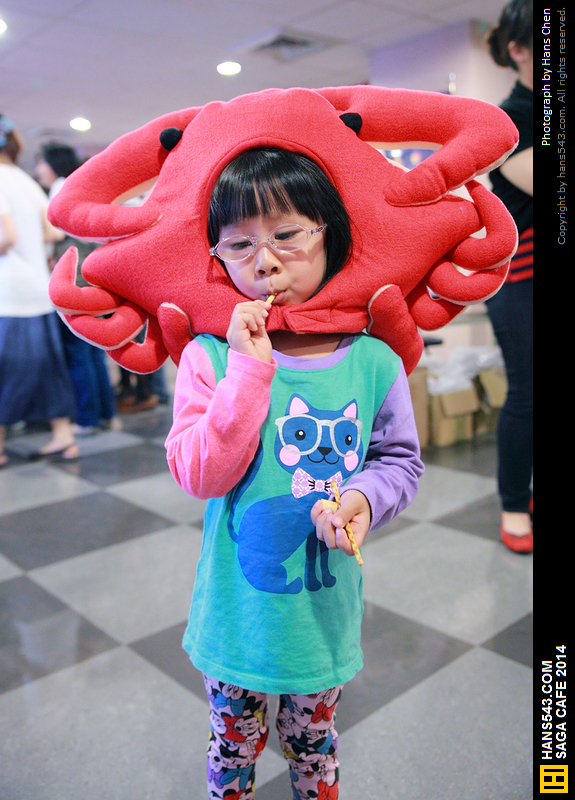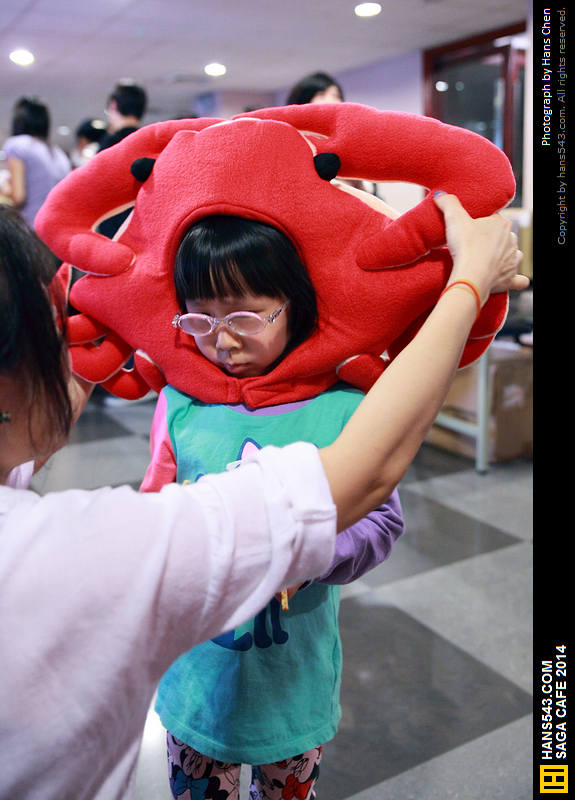 活動的大姐姐看Q比可愛,幫她選了一個螃蟹頭套戴上,