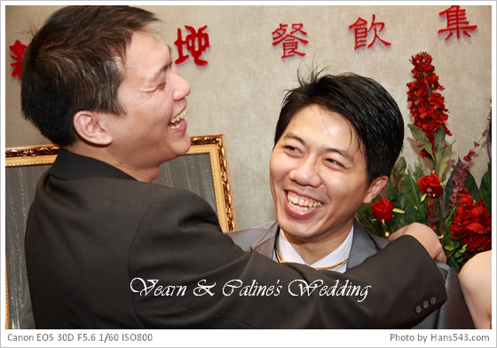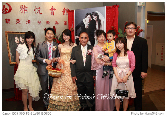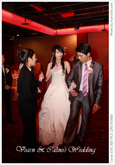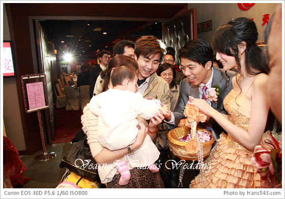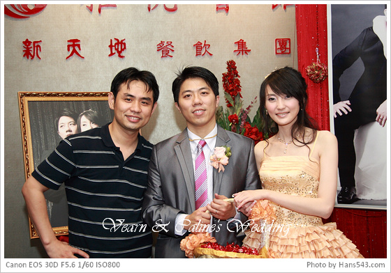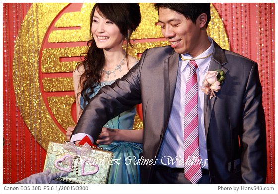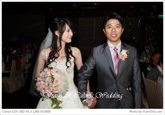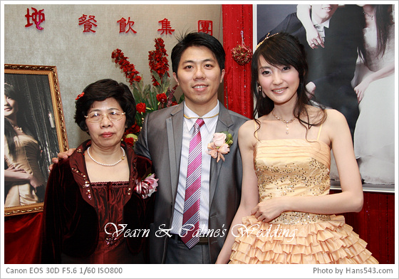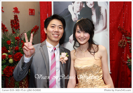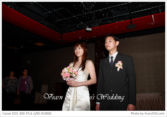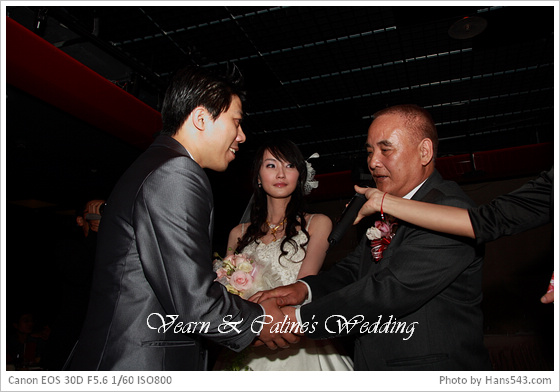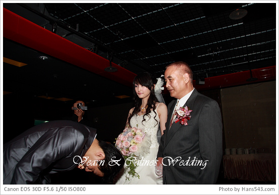 不過這裡翰斯要說明一下,除了現場的光源偏紅,拍照時要注意白平衡之外,會場的天花板還是全黑的…一點都沒辦法打跳燈…Orz,當橫的構圖時還OK(翰斯是拉出反光板補光的),但是直的構圖時,因為外閃將位於兩側,直打光線不自然,跳燈又失效,反光板因為方向的關係也用不到…翰斯只好拿一張小白紙卡(其實,翰斯是用新人的謝卡背面來充當的XD),當直拍時把小紙卡放在外閃的上頭充當反光板,試照了幾張之後覺得效果還不錯,才安心了不少…