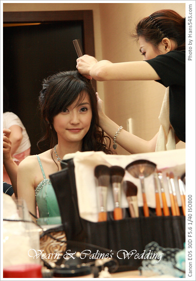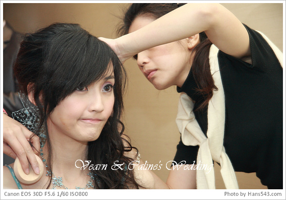 這張是翰斯非常喜歡的一張,翰斯是在鏡子前利用鏡子反射拍的,剛好前方有團白紗類的東西擋住,讓照片有種「偷拍」、「側拍」的感覺…XD,加上快門慢到1/8秒(哈!翰斯手真穩XD),旁邊的婚秘化妝動作因速度而模糊了,能表達出新娘造型準備的忙碌與急迫感,翰斯個人相當喜歡~